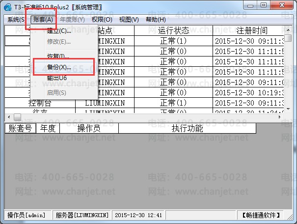 备份步骤:系统管理--系统--注册--用户名 admin---帐套---输出--选择帐套---确定。建立一个空文件夹。当软件提示 选择备份位置的时候 选择刚才新建的文件夹 注意:选择的文件夹 一定要双击张开。