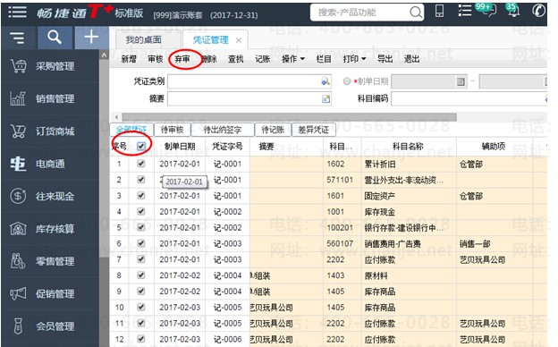 注:也可以直接在填制凭证界面找到这张凭证点击弃审,对单张凭证进行弃审。