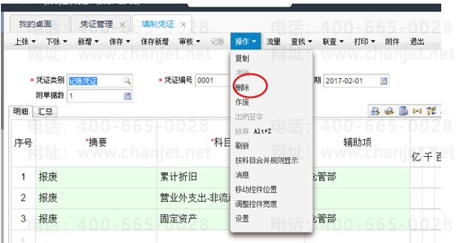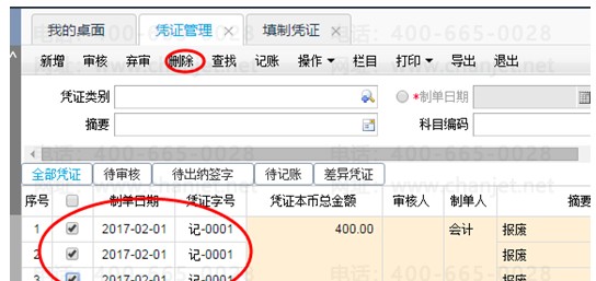 4.2、删除凭证:在凭证管理界面直接勾选要删除的凭证(前提是未审核)或者直接在填制凭证界面找到这张凭证点表头的操作—删除
