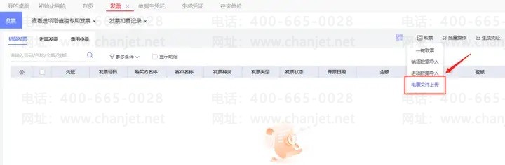 1、打开【发票】,鼠标停留在【取票】上,选择【电票文件上传】