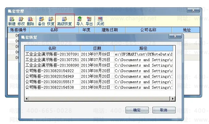 注意:“高级恢复”可以在账套管理中没有账套的情况下选择备份文件恢复数据。