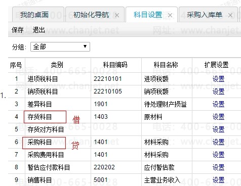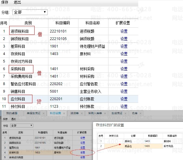 注意:如果【存货科目】分为原材料、产成品明细,那么可以点开【扩展设置】下的【设置】,入账到不同的科目。