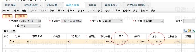 7、下月,参照采购入库单生成进货单(采购发票),保存、审核。进货单( 采购发票)实际入库单价 0.03,入库金额 30。并对进货单生成凭证。