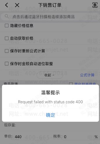 移动端选择某一客户下销售订单就会提示:网络请求发生异常 Request failed with status code 400