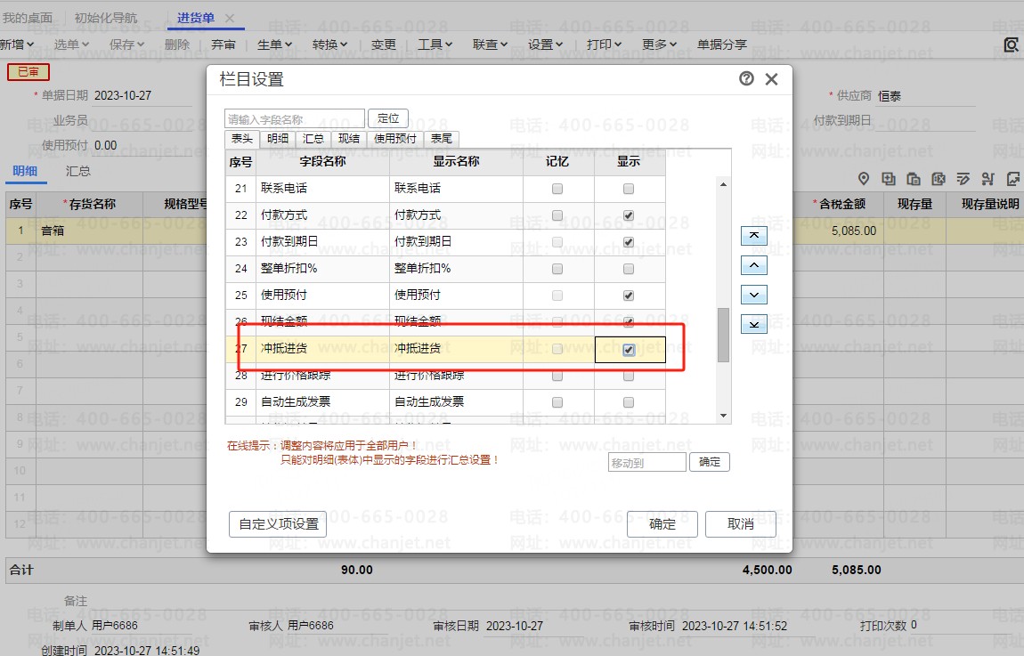 步骤一、打开进货单,点击操作—栏目设置—表头页签,将表头页签中的冲抵进货字段显示勾选上,在进货单表头出现冲抵进货字段。