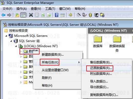 ①、打开数据库的企业管理器,右键数据库,所有任务,还原数据库