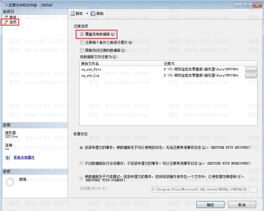 ⑤、再点击选项,勾选“在现有数据库上强制还原”。再点击确定还原即可