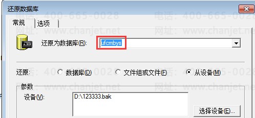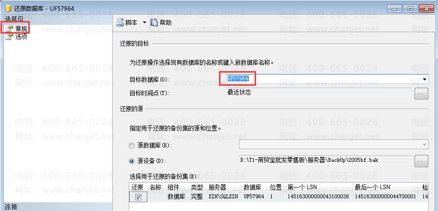 ④、重新回到常规界面,将“还原为数据库名”修改为ufcmbys
