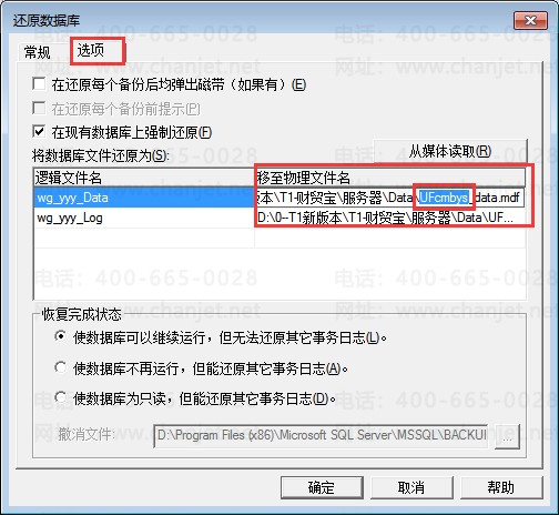 ③、点击选项,查看“移至物理文件名”中的数据库名称,如下图,是ufcmbys