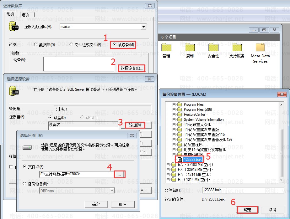 ②、点击从设备,选择设备,添加,点击添加按钮,选择具体备份文件,点击确定恢复