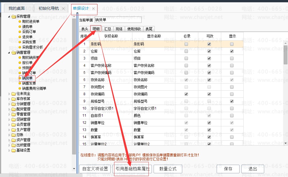 1、点击系统管理中的单据设计,然后找到销货单,点击明细后再点击界面上“引用基础档案属性”。