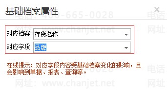 2、在弹出界面上,对应字段中选择存货名称,对应字段中选择品牌,然后点击确定并保存。