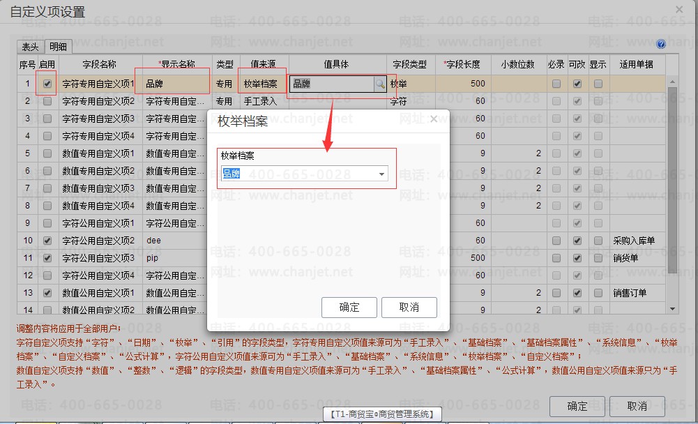 2、在弹出界面上,把专用自定义项1勾选上启用,显示名称设置成品牌,值来源选择枚举档案,值具体选择品牌,勾选上显示并保存。