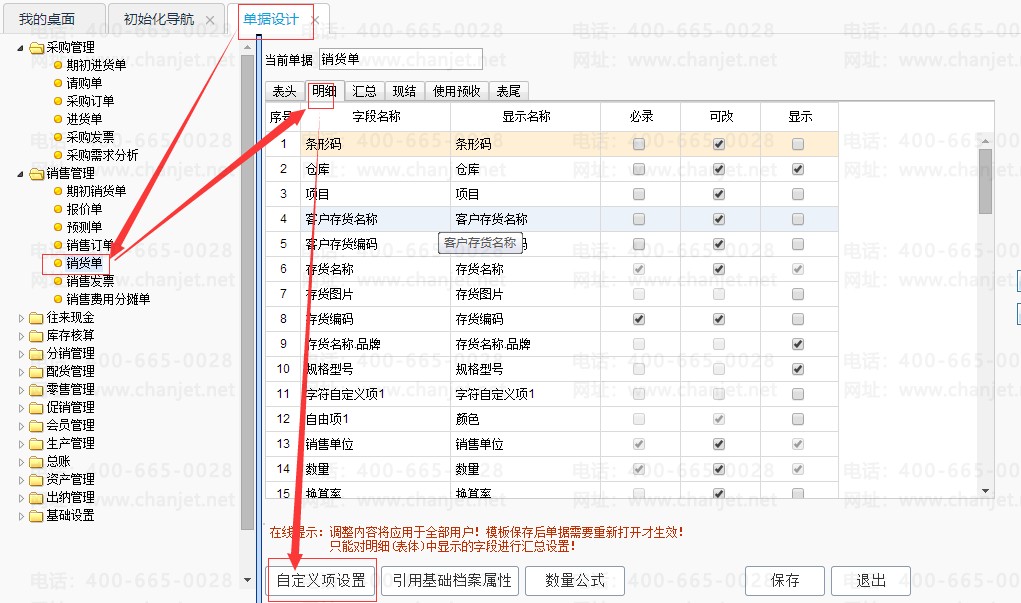 1、点击系统管理中的单据设计,然后找到销货单,点击明细后再点击界面上自定义项设置。