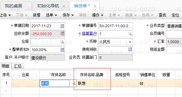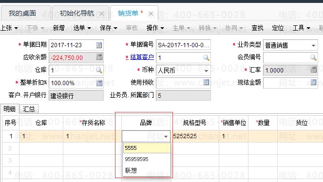 3、新增销货单的时候,在销货单的界面上可以对应选择所需的品牌。