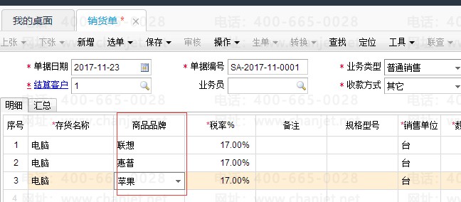 3、新增销货单的时候,可以选择到品牌,并且同一个存货可以对应不同的品牌。