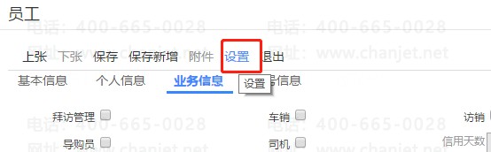 3、此时点击上方的设置,检查【业务信息】页签,【业务员】字段是否正常勾选显示