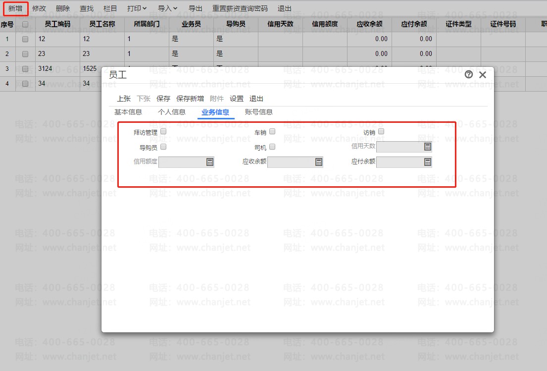 2、点击【新增】,切换到【业务信息】页签,没看到【业务员】这个勾选