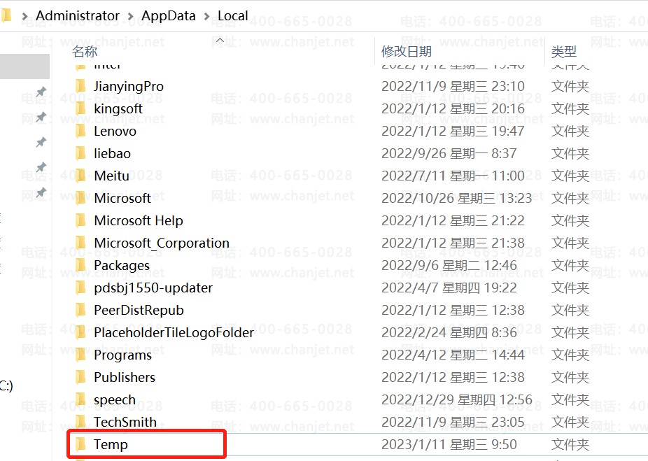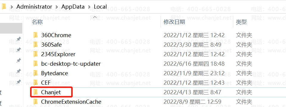 2.1、接着返回上一个文件夹appdata,在local文件夹里删除chanjet命名的文件夹