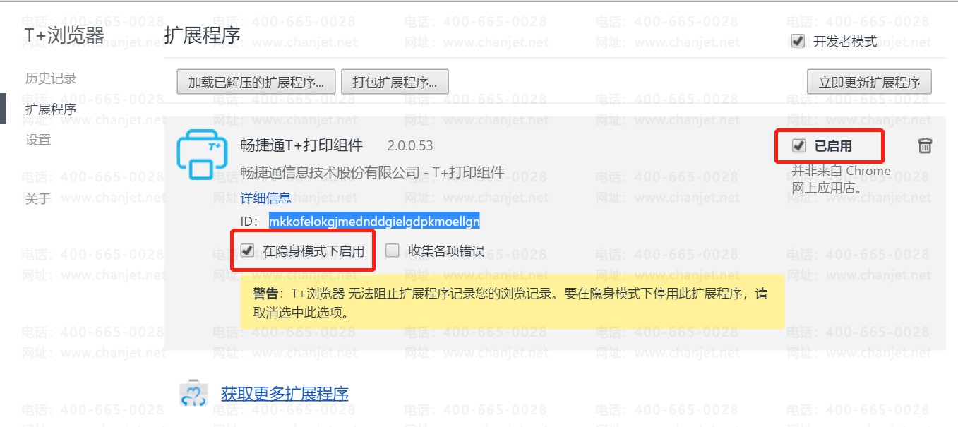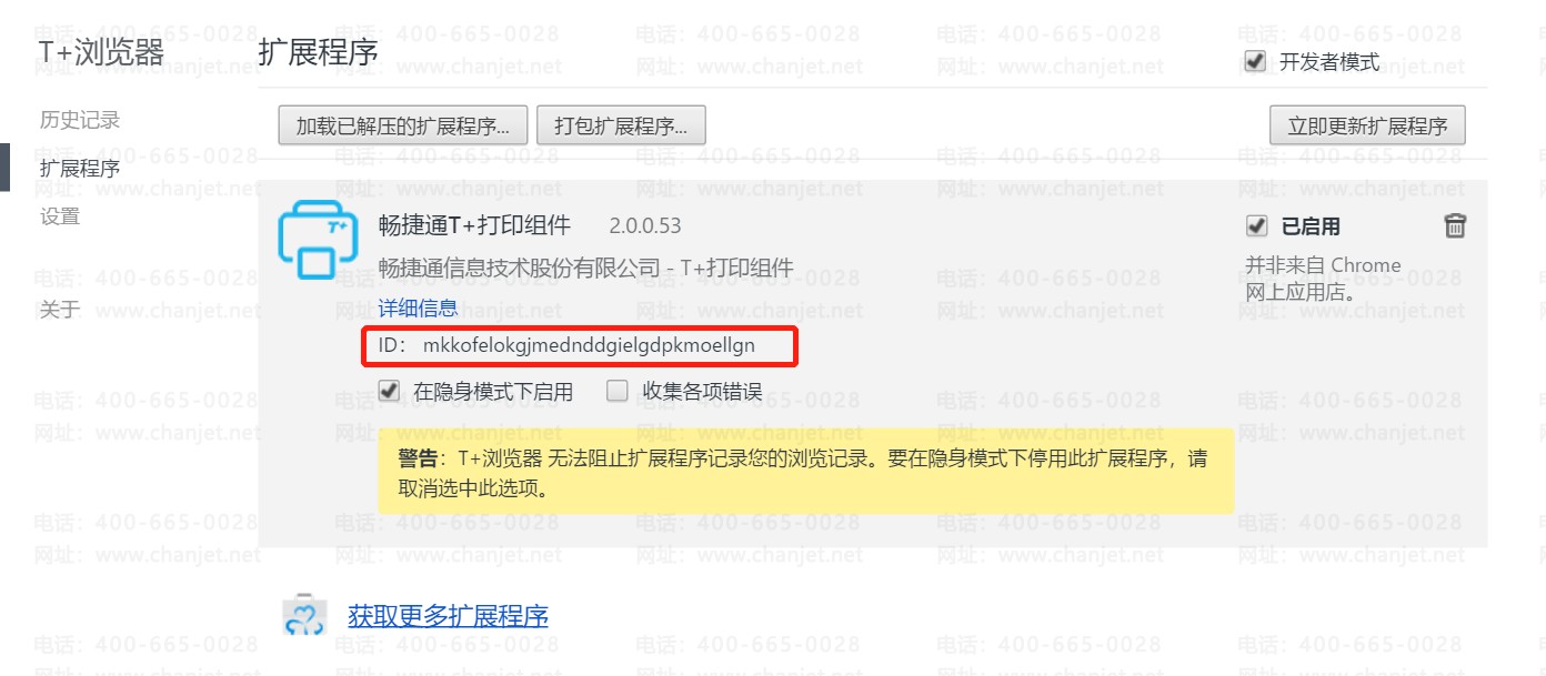 8、找一个打印正常的环境,点击T+浏览器右上角三条杠,点击【设置】-【扩展设置】,勾选【开发者模式】并启用T+打印组件,复制粘贴T+打印组件的ID,ID:mkkofelokgjmednddgielgdpkmoellgn是插件的文件名称,找到该文件所在路径,例如截图所示: