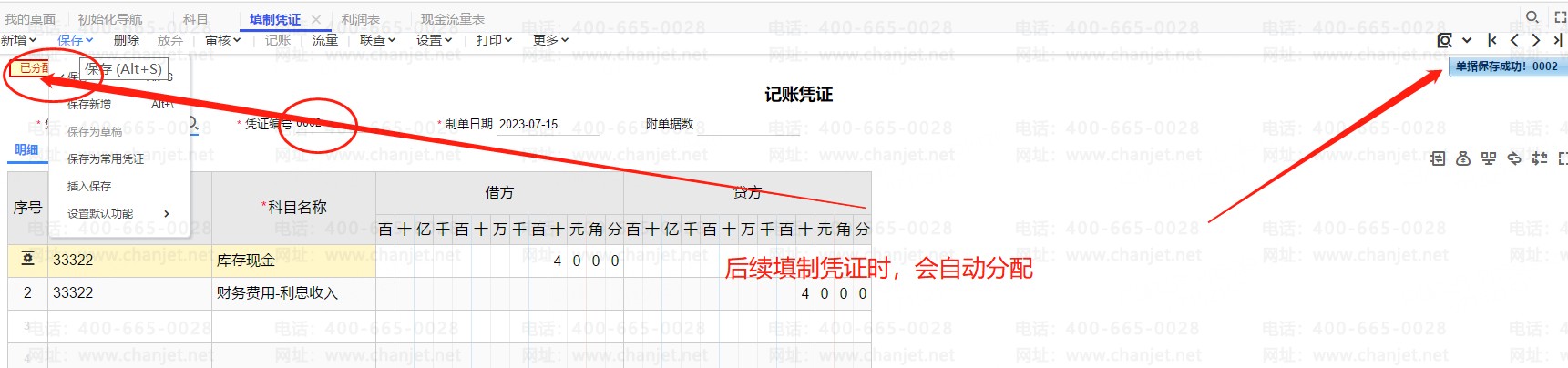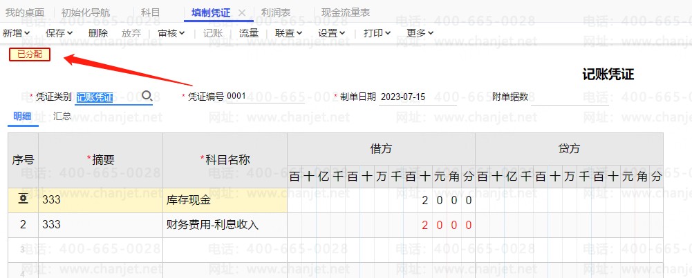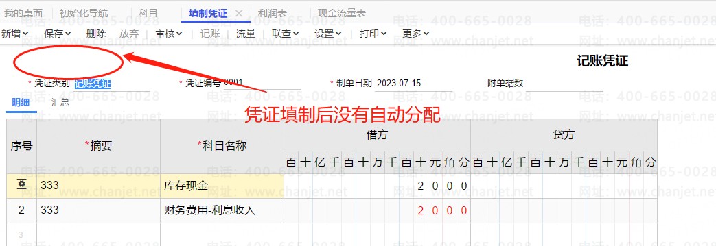 第一次填制时,不会分配,要先手工分配,后续调整时,会自动分配