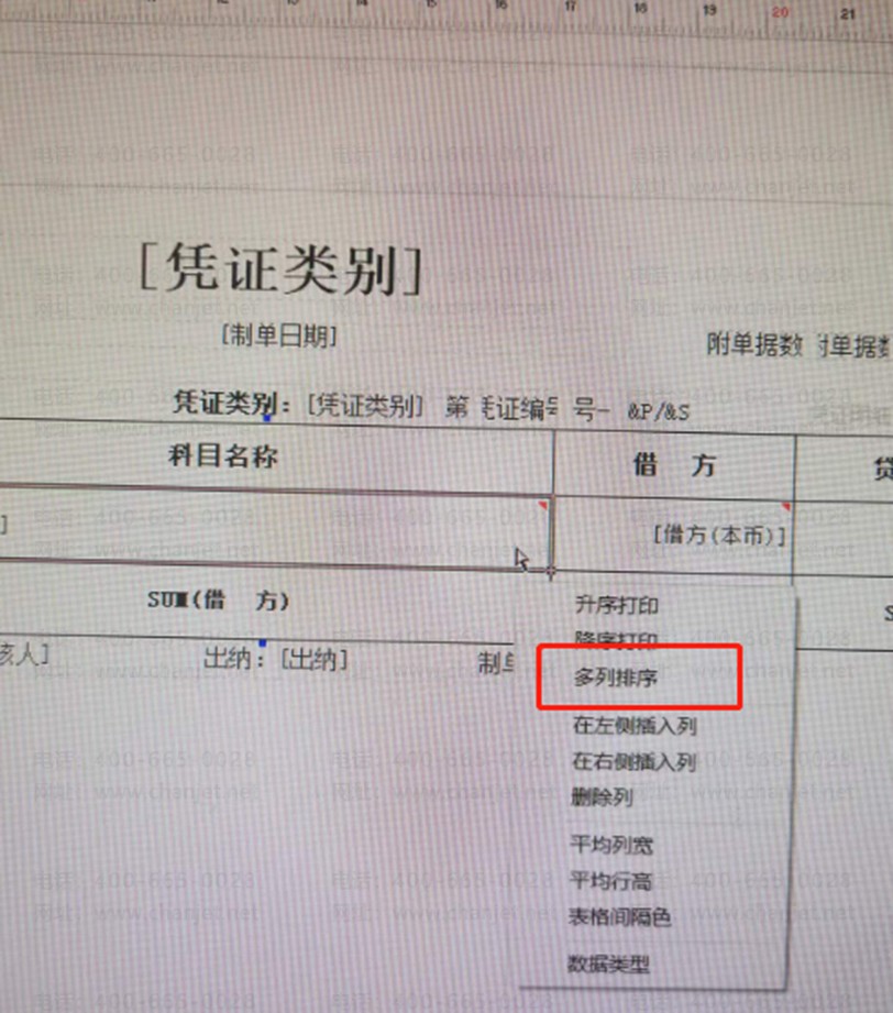 1. 打开凭证的打印模板设置,选中科目名称右键【多列排序】
