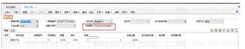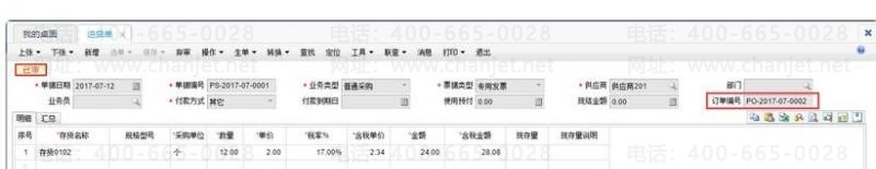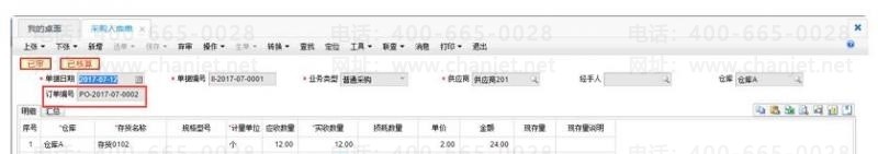 到此,在采购入库单据上,其订单号码已经显示出来了。