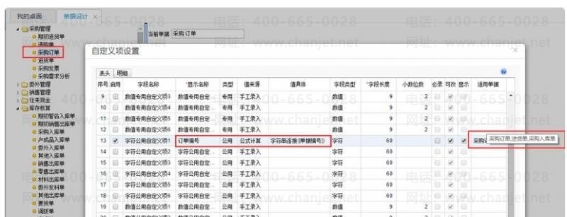 第一步:打开单据设计,采购订单,自定义项设置,启用表头字符公用自定义项,值来源选择公式计算,值具体选择单据编号,适用单据采购订单、进货单、采购入库单保存设置。参照下图操作即可: