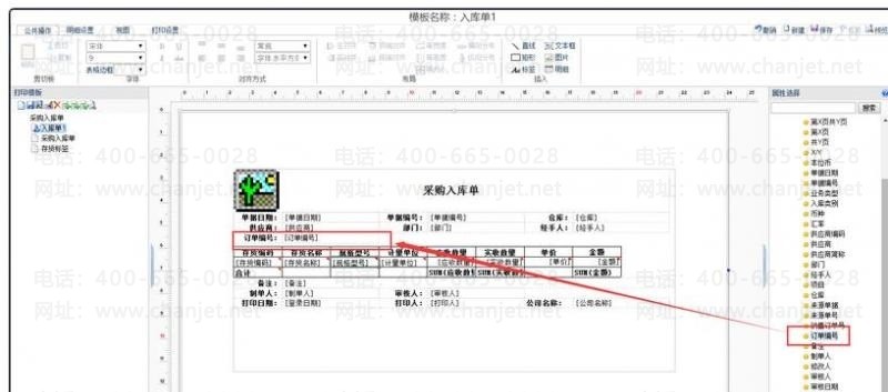 第五步:设置采购入库单打印模板将表头字符公用自定义项-订单编号设置到表头上,另存为新的打印模板,参照下图。
