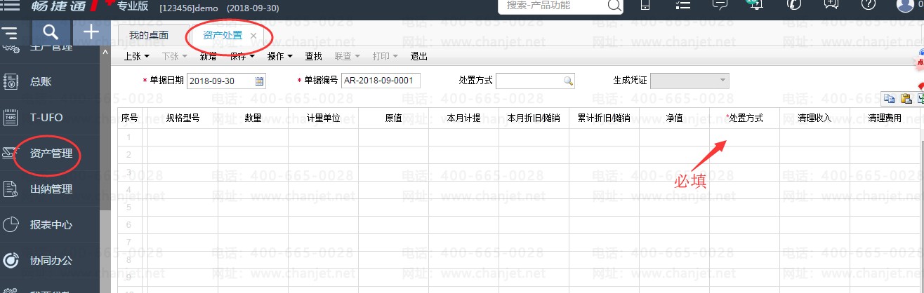 1、点击资产管理-业务处理-资产处置,在表体中填制需要处理的资产卡片,处置的方式和清理收入和费用等信息;