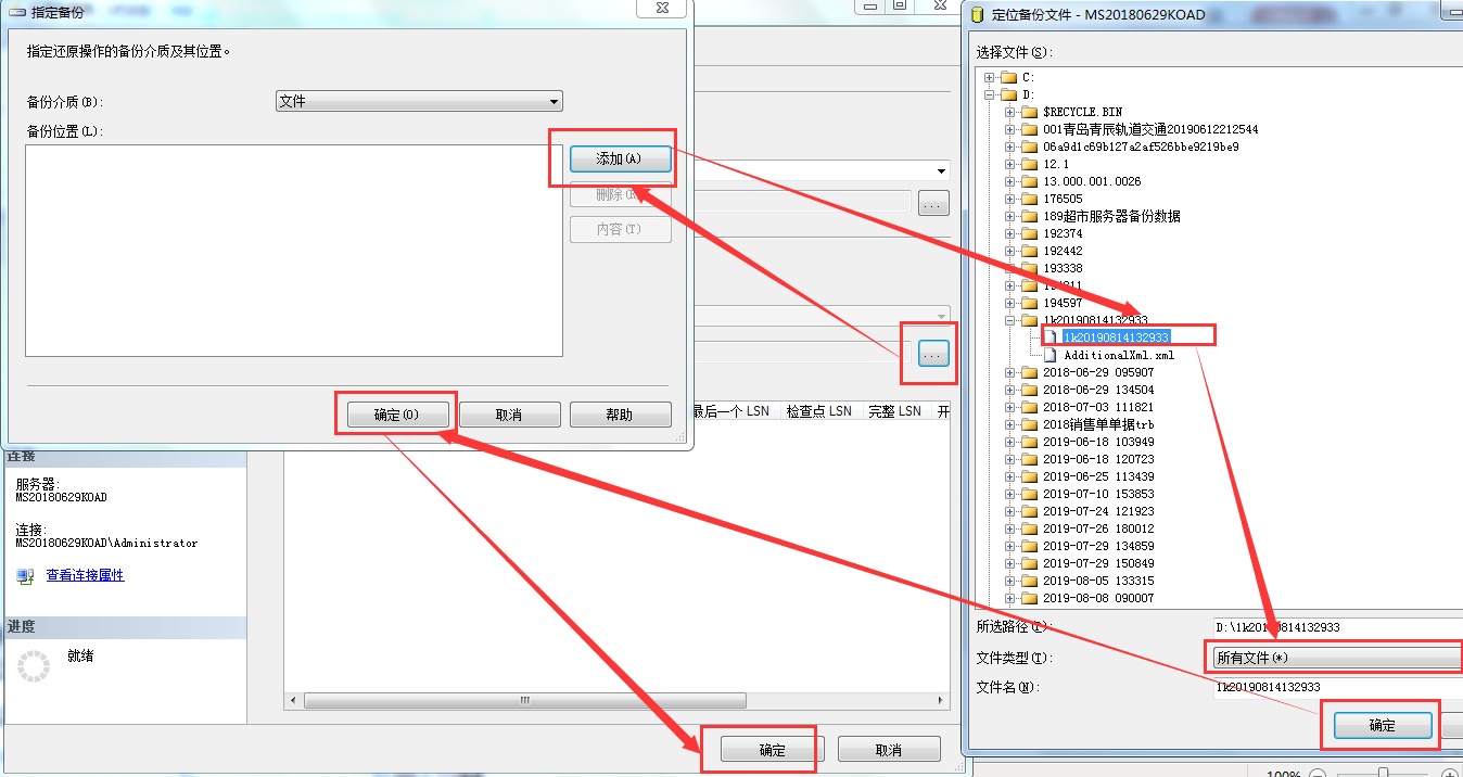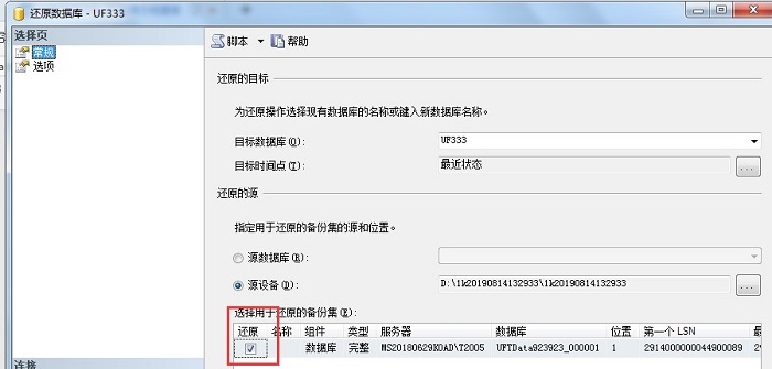 第三步:在点击上一步中最后一个确定前,注意在界面上的选择用于还原的备份集中,需要勾选上选择的备份数据文件,另外在常规中需要勾选上覆盖现有数据库。