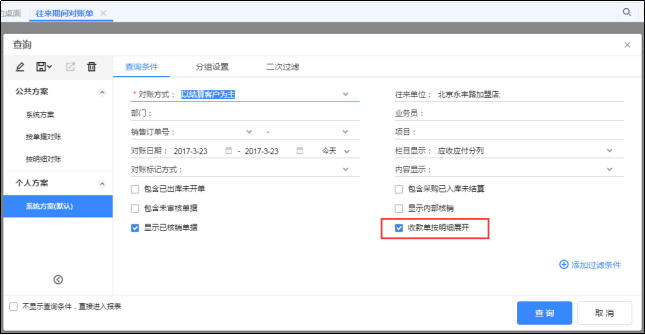 如果往来期间对账单查询条件勾选了“收款单按明细展开”,那么不论销货单和收款单上的内容如何,查询结果里收款单都会按照销货单的明细行展开,每一行对应的部门/业务员/项目都取自销货单。