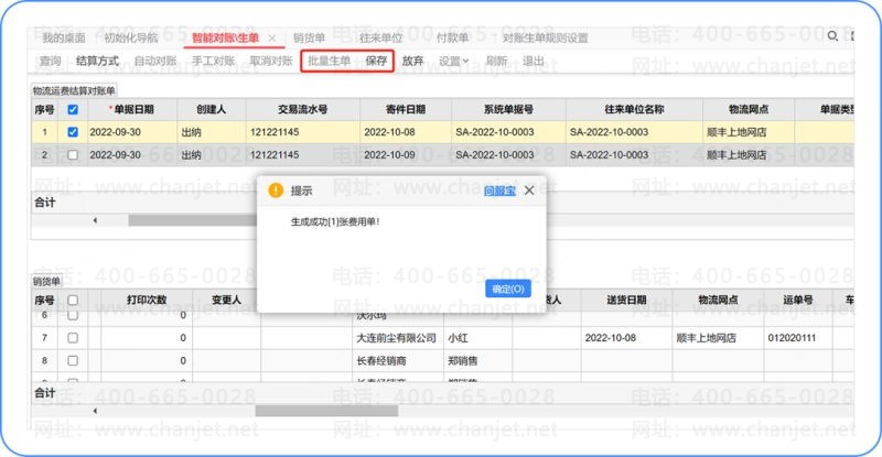选择需要生单的对账单记录,点击“批量生单”并保存,系统根据设置自动生成后续单据。