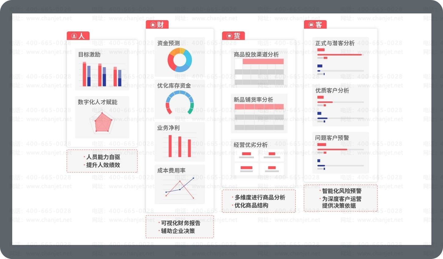 抓收入:设置商品价格,保利润控成本:成本核算精细到商品批次和价格;呆滞存货分析、库存周转率分析,优化商品结构规范化:信用管控,限制赊销额度,收款预警,规范付款流程
