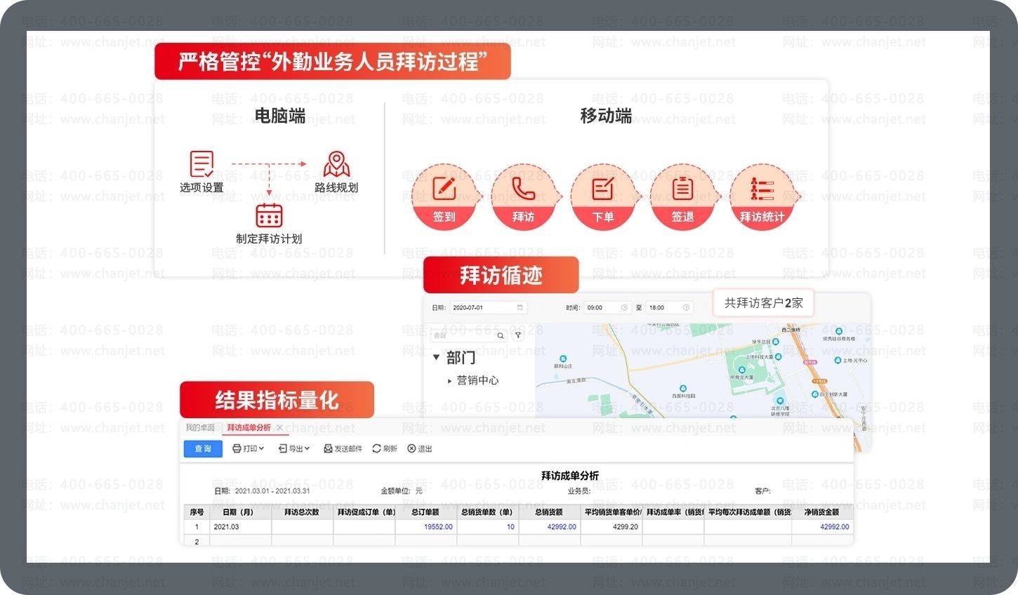 优化线路:科学规划拜访线路,节省拜访时间规范流程:规范拜访流程,手机实时处理客户需求,拜访轨迹可回看,过程可记录查验结果分析:拜访的客户量、订单量、回款额等结果数据可分析,考核有依据业务预警:客户订货和业务员拜访数等关键环节预警提示