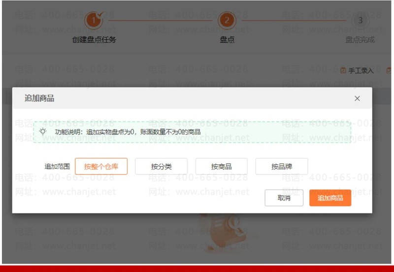 第二步:提取以及仓库的商品,可选择追加商品的范围:按整个企业仓库、按分类、按品牌、按商品信息提取相关商品经济数据。