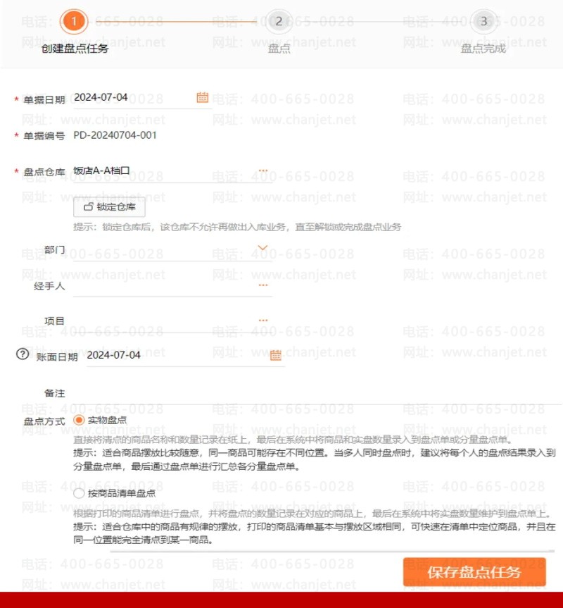 第一步:创建库存任务并填写库存日期、仓库、库存账簿日期。