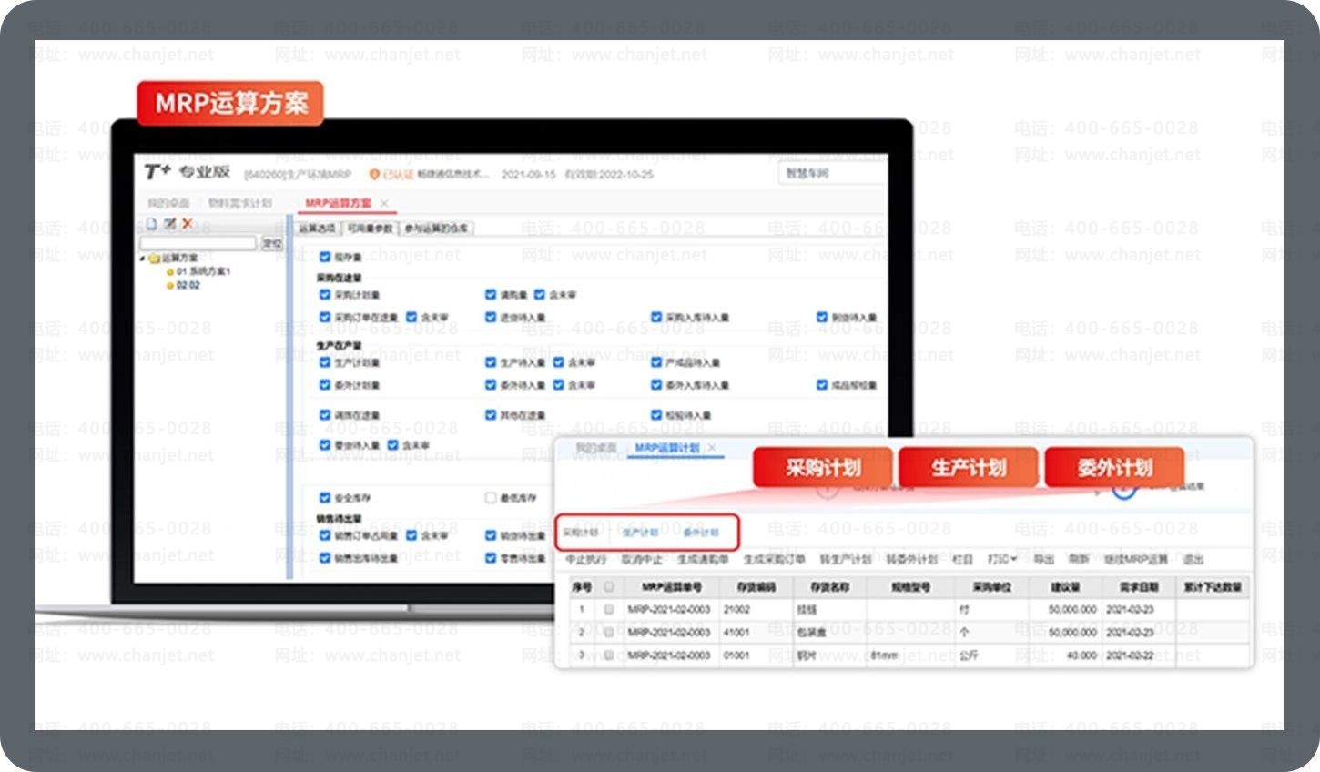 根据销售订单或预测单,参考BOM,可用量,提前期、批量形成采购、生产、委外计划。精 准投产,合理采购,优化库存