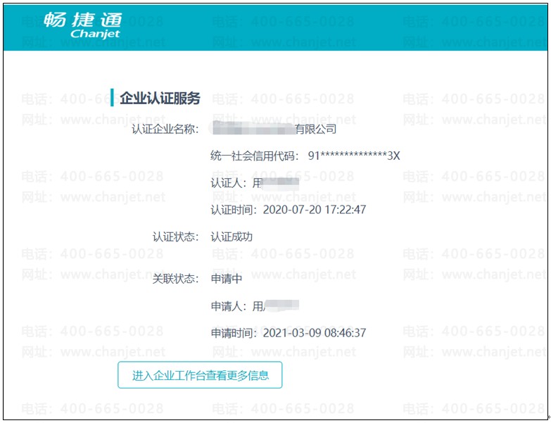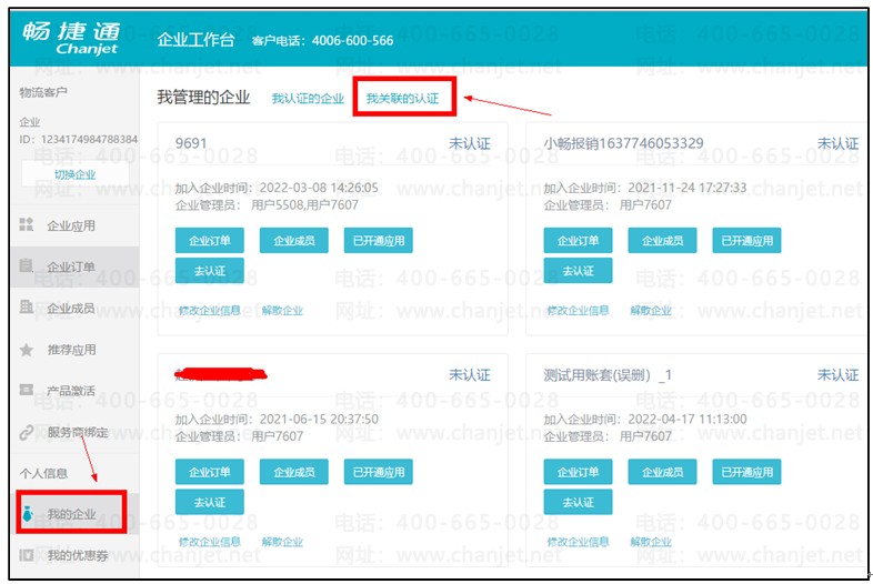 用申请人对应的用友畅捷通账号登录企业工作台,左边点击【我的企业】打开【我关联的认证】-点击界面右上角【移交认证人】