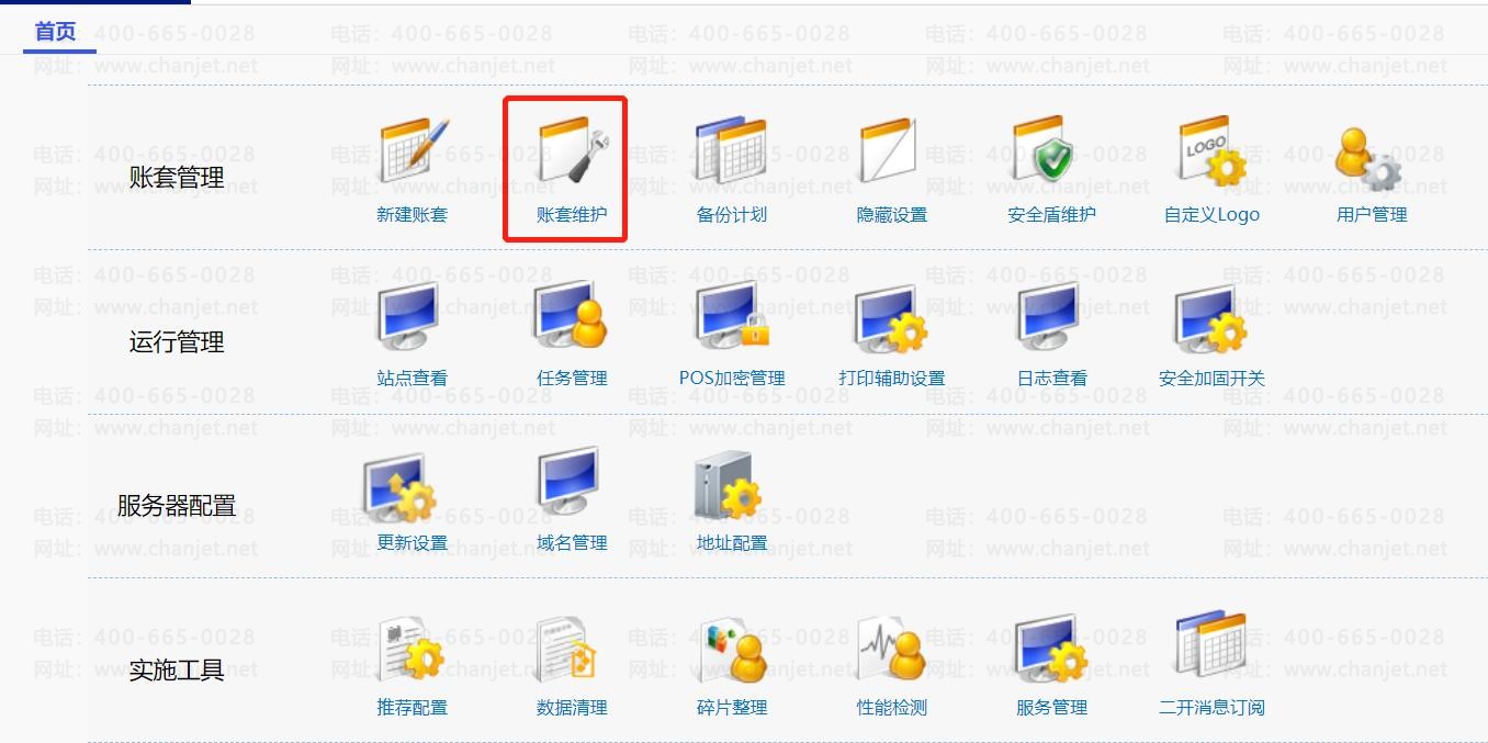 a、使用系统管理员 admin 登录系统管理,点击“账套维护”,如下图所示: