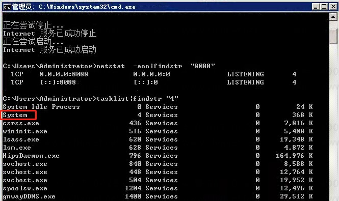 可以看到,端口被PID=4的进程占用了,接下来查看该PID的进程。