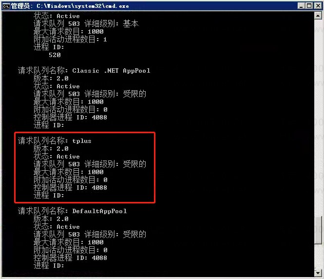 再次,输入命令:netsh http show servicestate可以看到,http服务器状态快照,找到已注册的URL数目中占用8088端口的请求队列名称,本例中占用8088端口的请求队列名称为tplus。