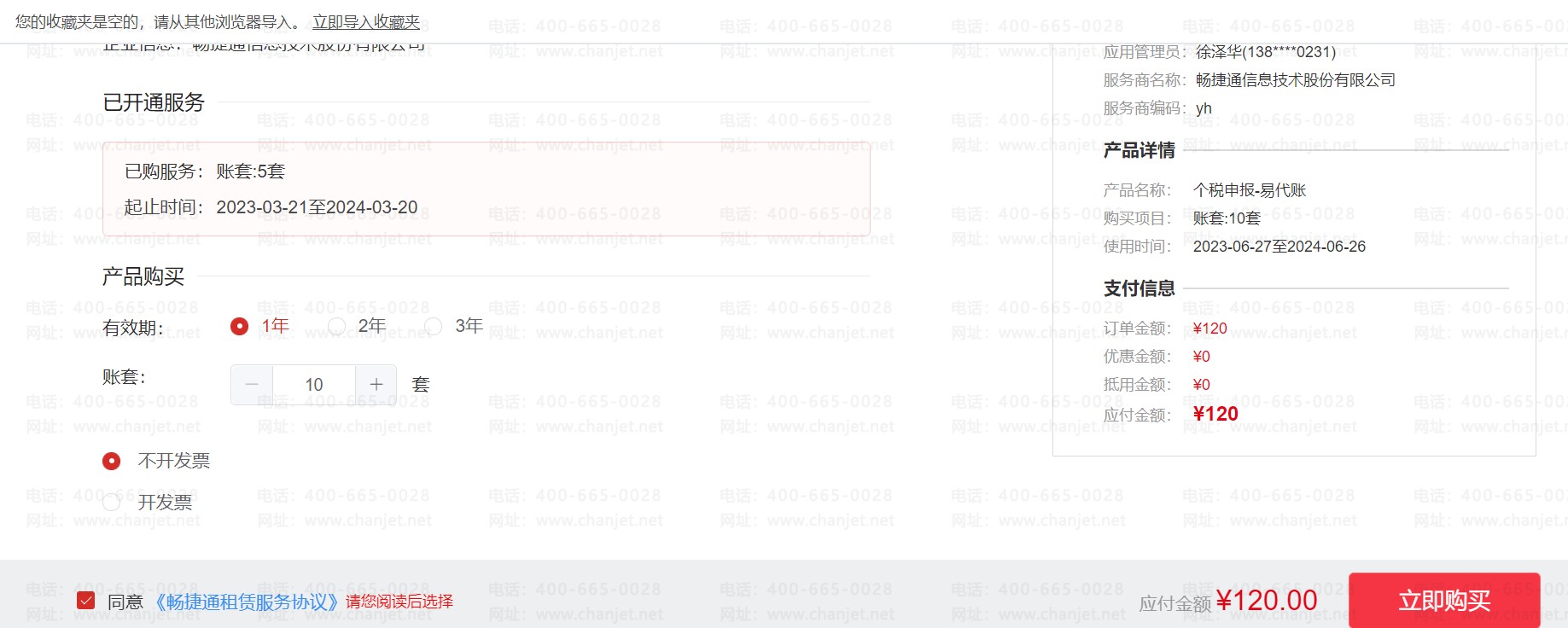 按照账套数量进行购买,一个账套一个年度为12元,10个账套起卖。