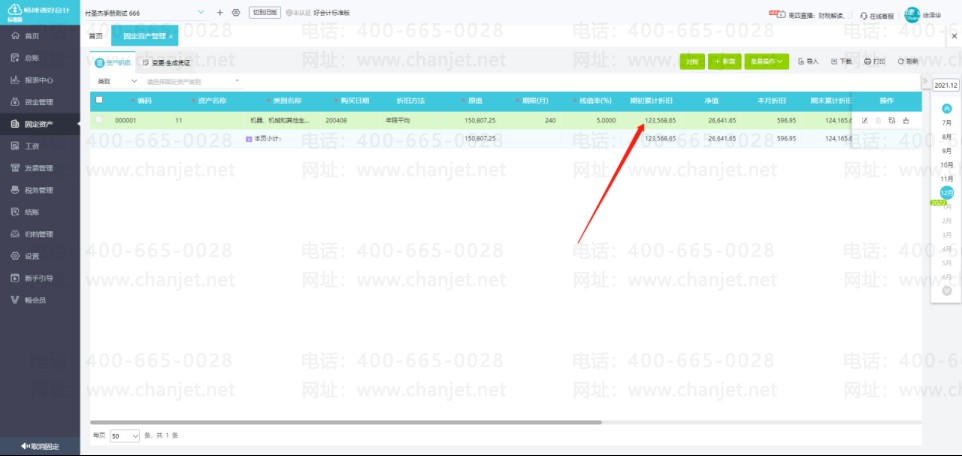 1.固定资产对账显示不平,先在“固定资产管理”模块中,查看相关有问题的固定资产,每月折旧额,与总账中该月份所计提折旧进行比对,如下图所示: