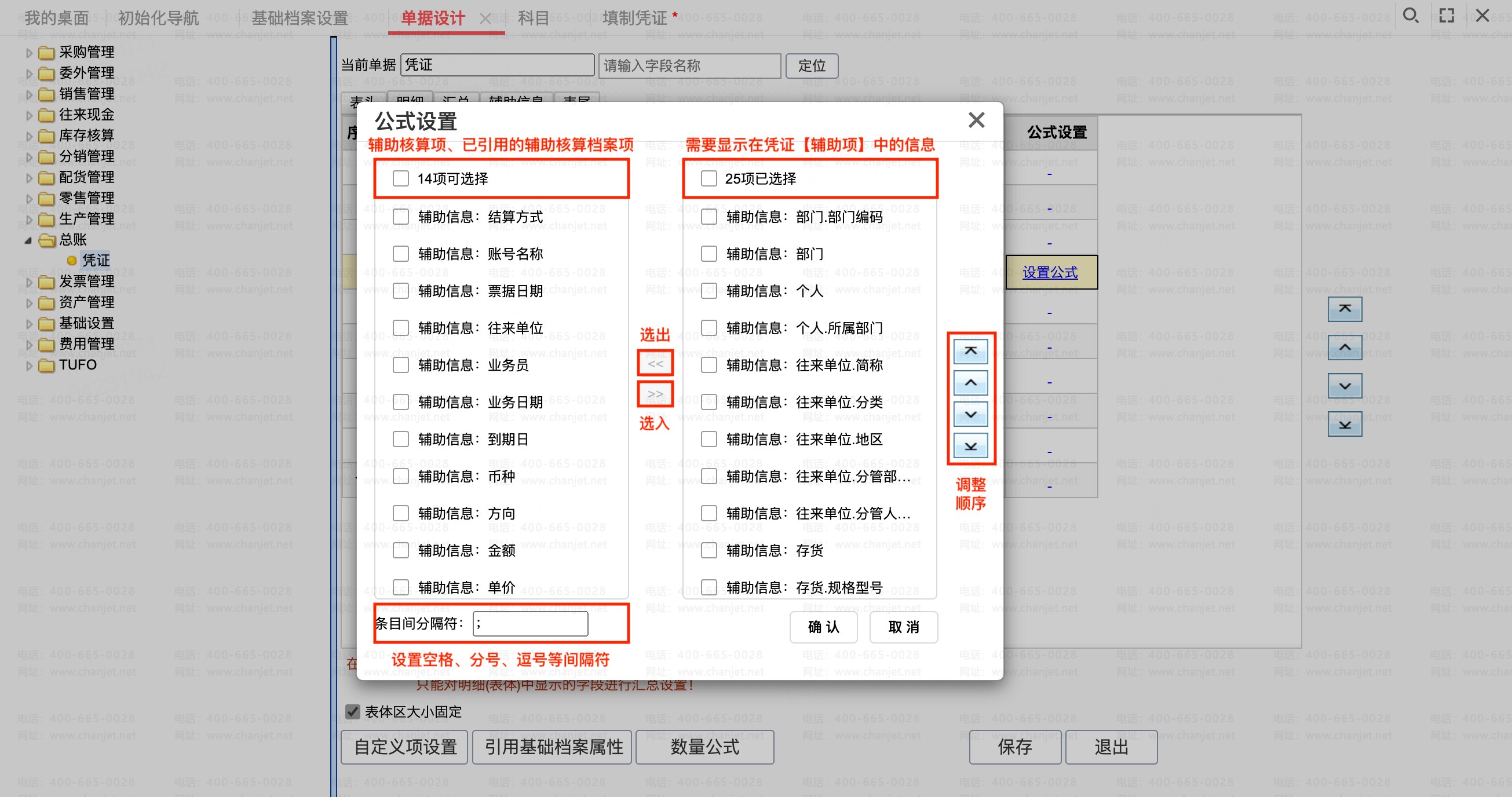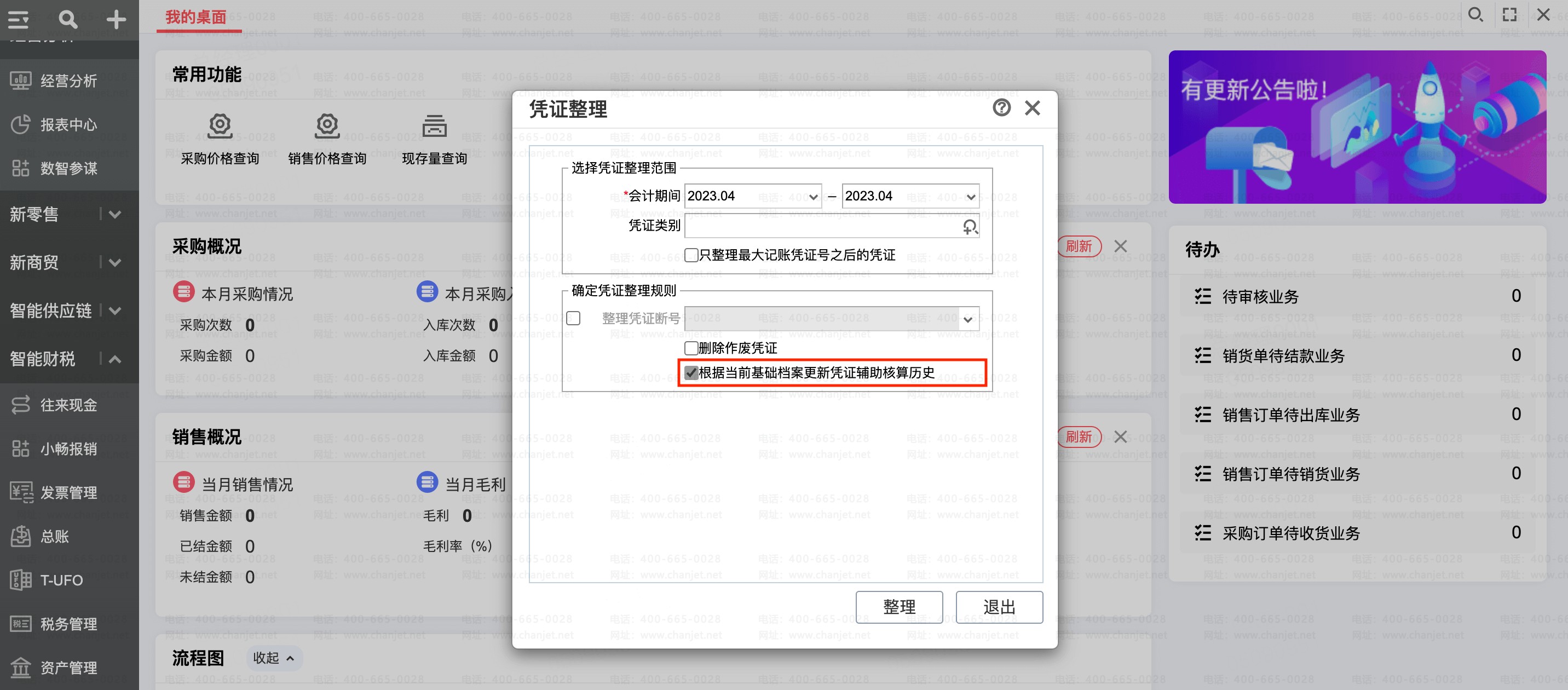 辅助项增减已选项:修改公式,不会自动更新历史凭证辅助项;总账-凭证整理,勾选【根据当前基础档案更新凭证辅助核算历史】,点击“整理”,可将历史凭证辅助项更新为最新已选属性值