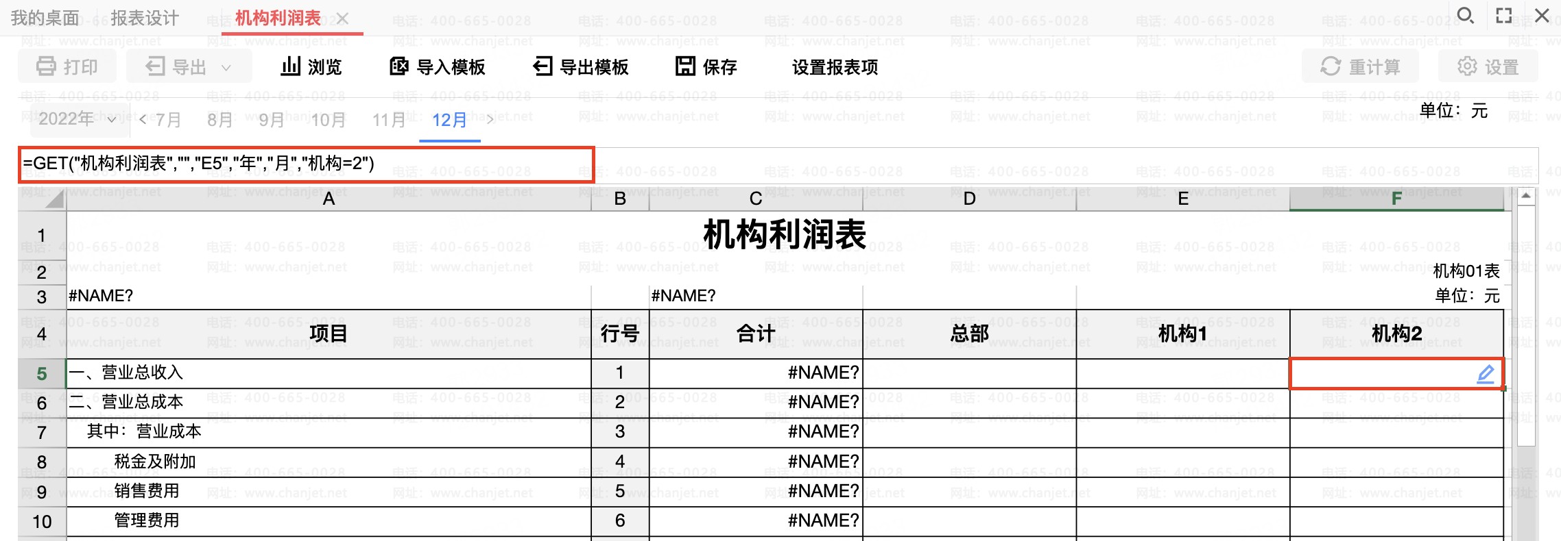 3、使用机构参数:GET("模板名称","表页名称","单元格","年","月","机构")