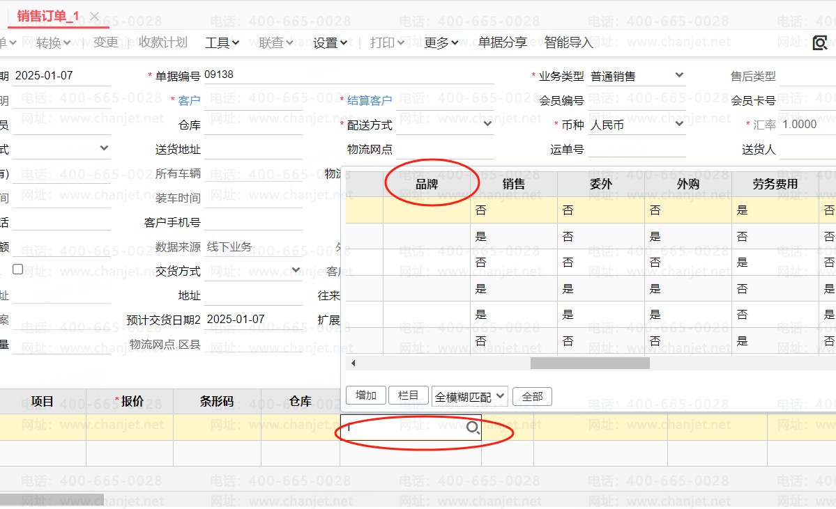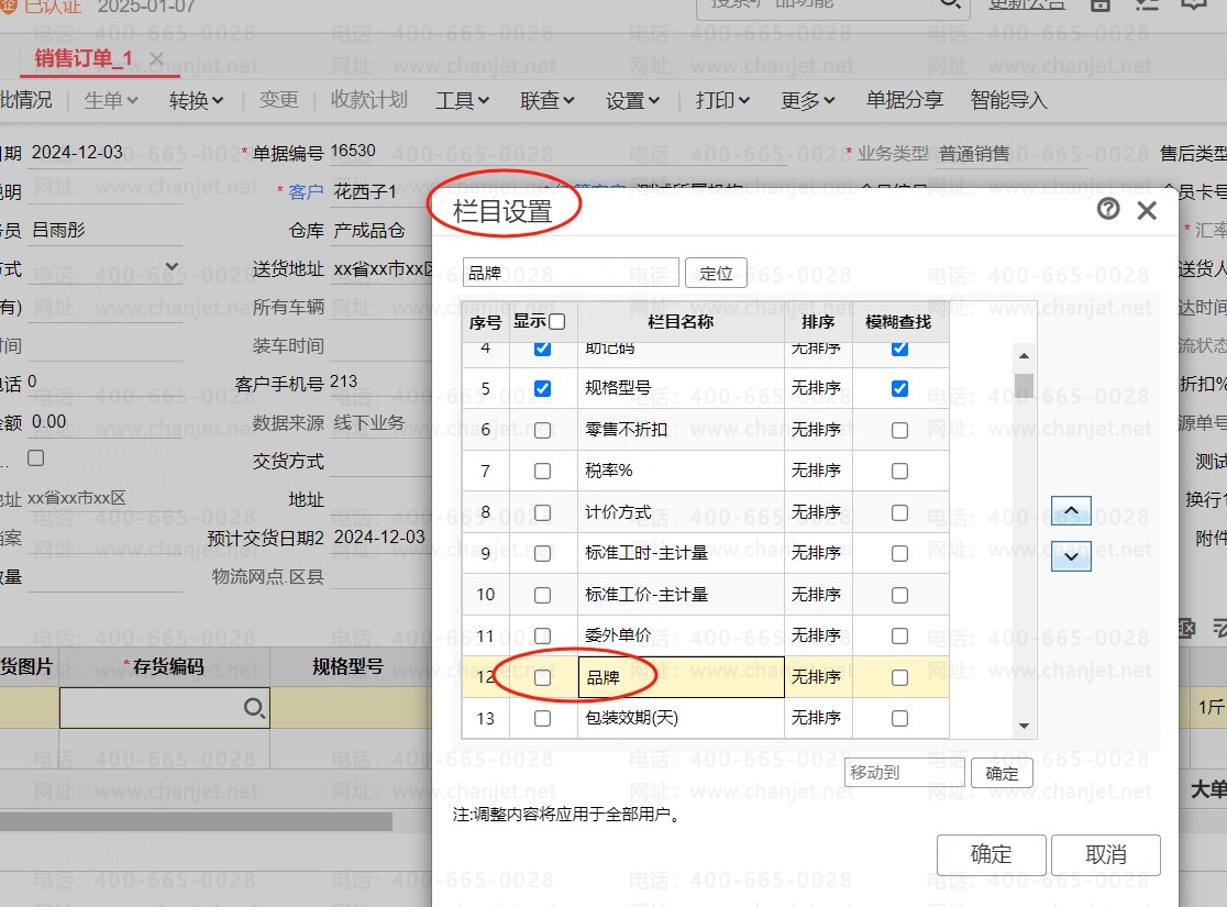 可以设置呢,模糊查询中点开栏目设置,把品牌字段勾选显示即可,如下图: