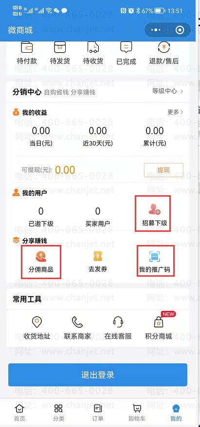 2、分销员进入小程序店铺,在【我的】页面通过招募下级和分享分佣商品来发展下级,下级用户购买,分销员可赚取相应的佣金,可以提升拓展新客的积极性。