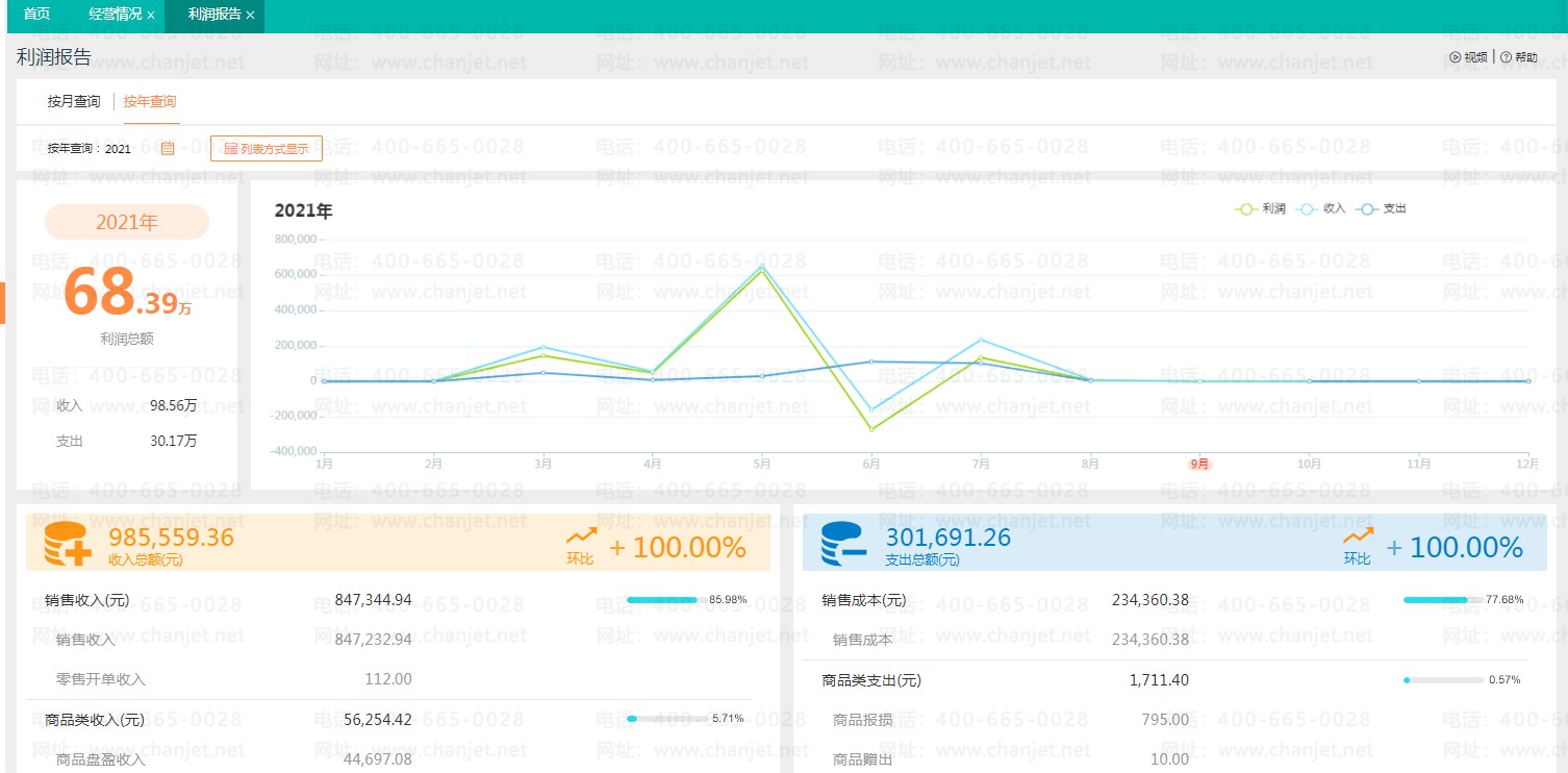 1、利润报表,一表统计企业销售、收入、进货、费用支出等业务数据;