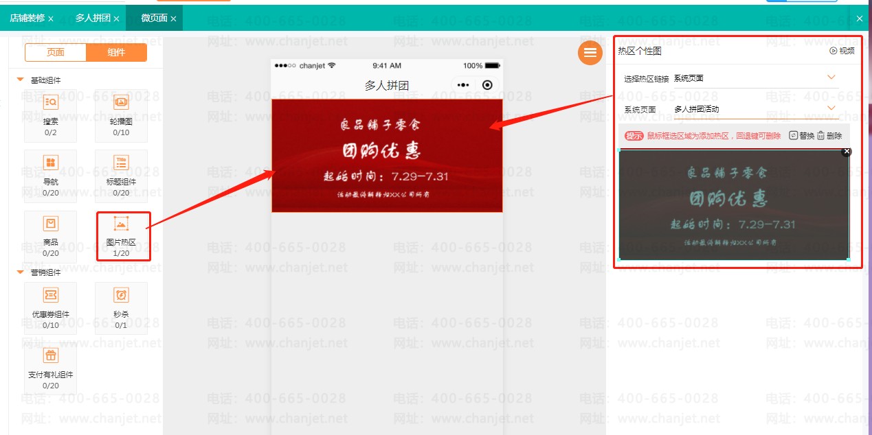 【微页面】,设置图片热区,添加拼团广告,添加页面组件【图片热区】,